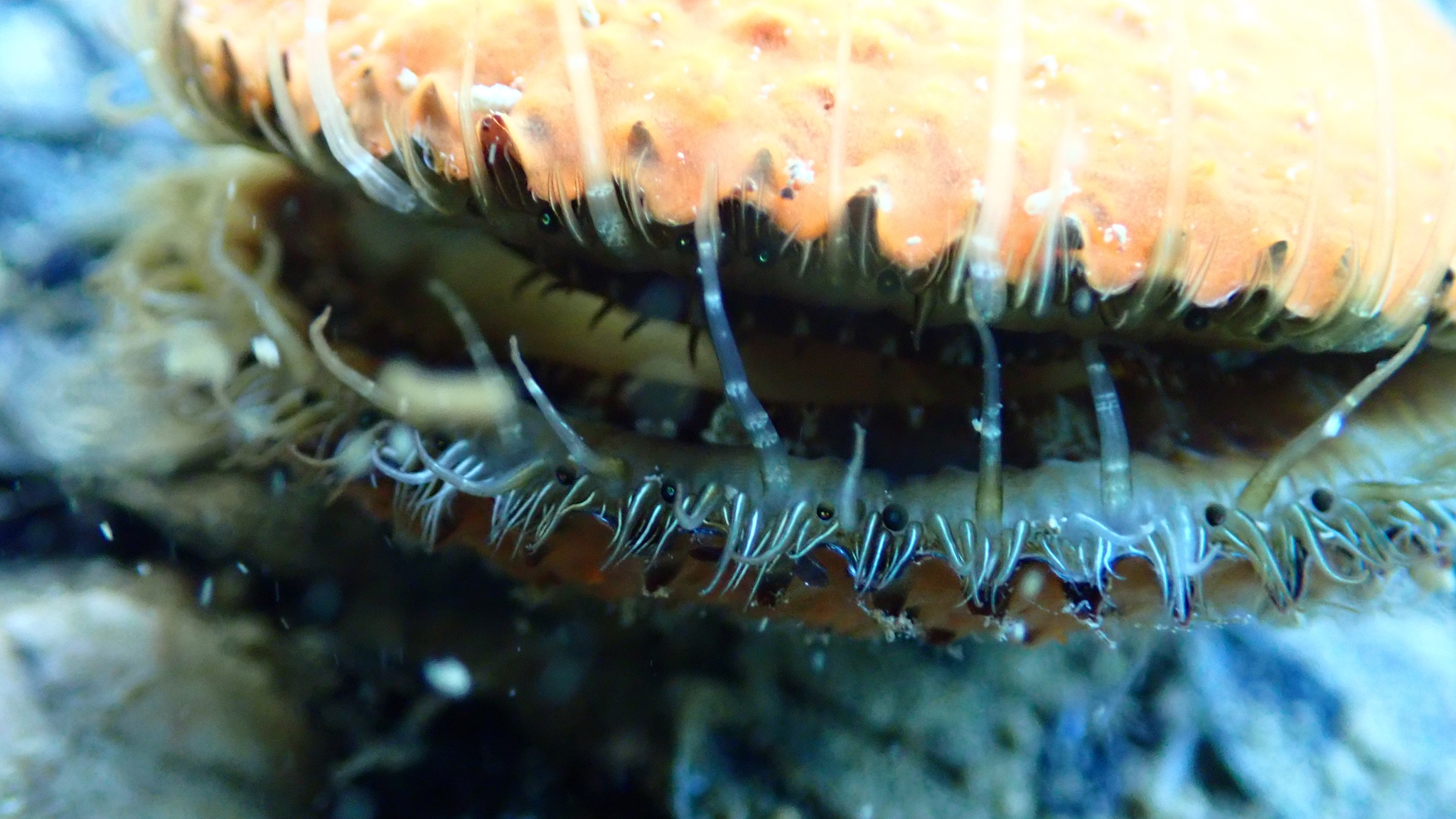 Denn: Kammmuscheln haben Augen! Und zwar Dutzende. Diese sind nur 1 mm groß, blau und zwischen den Tentakeln am Muschelkamm angeordnet. So ausgerüstet können Muscheln rechtzeitig ihre Fressfeinde erkennen und sich schließen oder sogar flüchten.