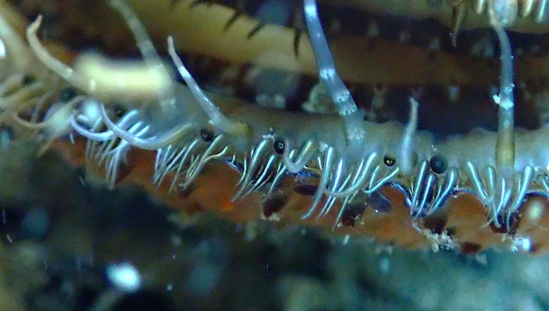 In der Vergrößerung sieht man die abwechselnd mit den Tentakeln angeordneten blauen Augen ganz deutlich: