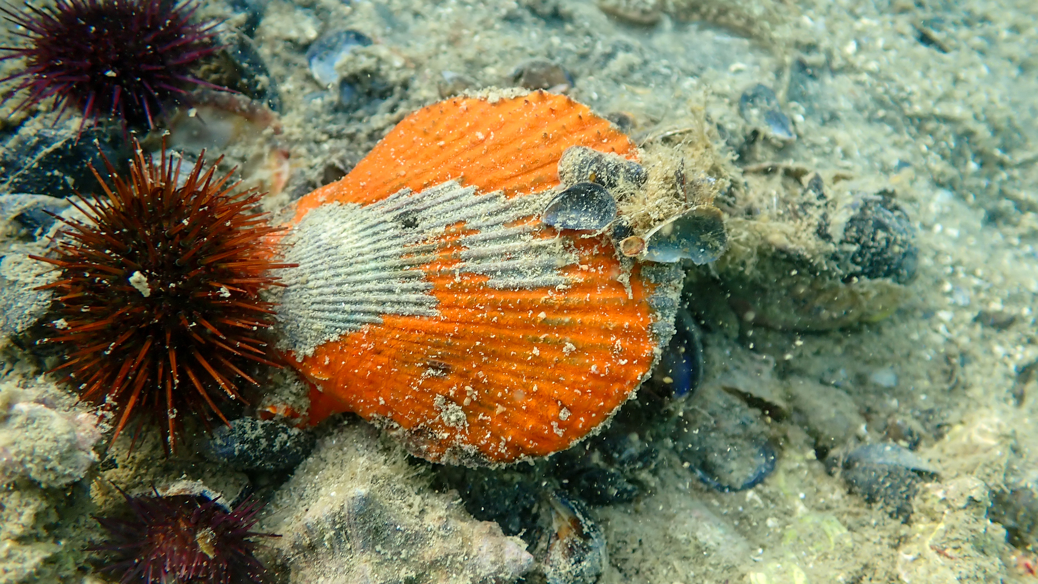 Hier sieht man eine weitere Kammmuschel auf dem Meeresboden im Ambrakischen Golf, umgeben von Steinseeigeln, ihren Fressfeinden.