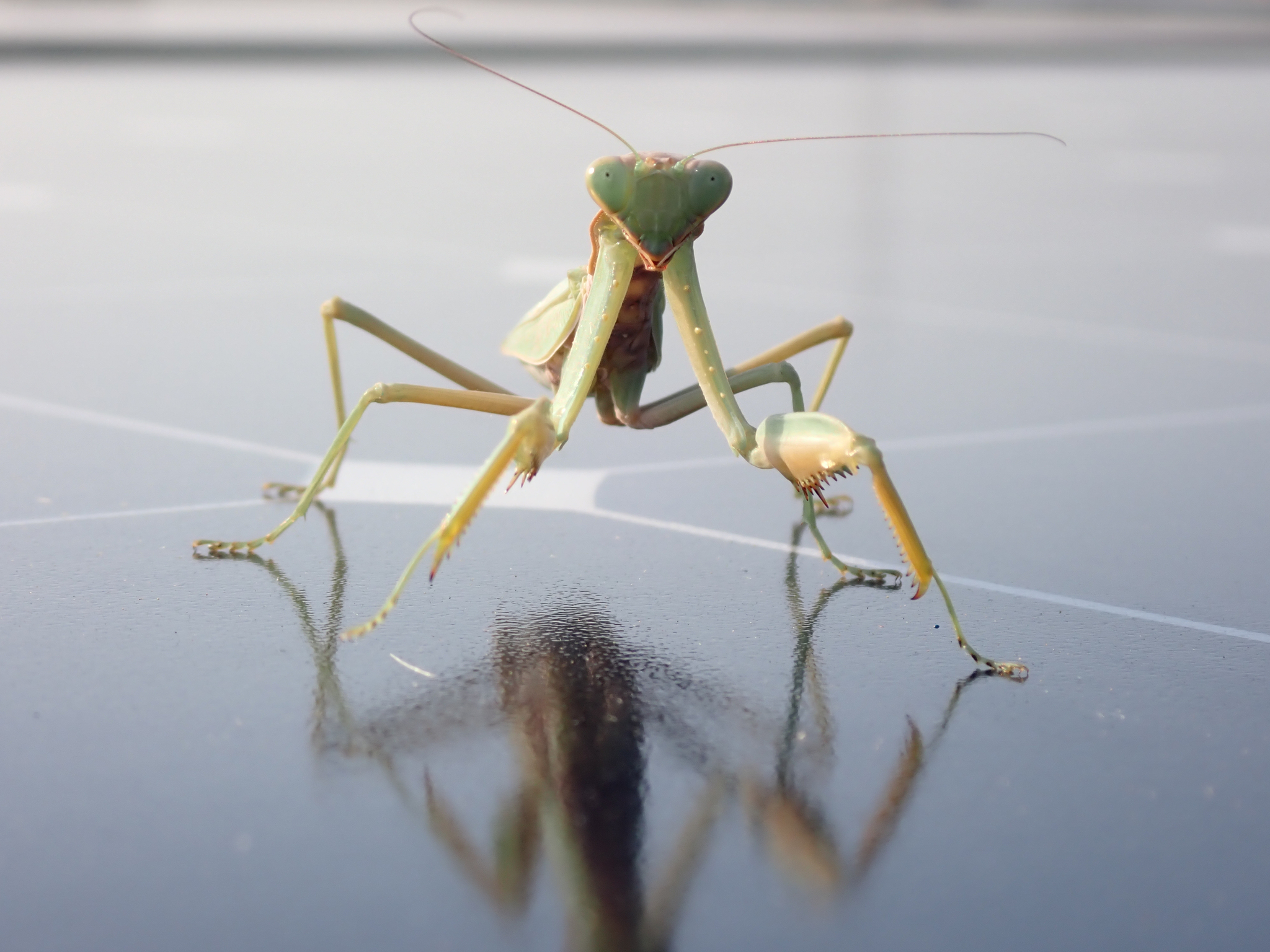 Wir merkten plötzlich wie wir angestarrt wurden. Und dann sahen wir sie auf dem Geländer der SolarWave sitzen. Gottesanbeterinnen haben ein wirklich beeindruckendes Aussehen und gehören mit ihren 7 bis 10 cm Körperlänge zu den größeren Fangschrecken. Außerdem haben sie sehr große Augen mit denen sie hervorragend sehen können. Und das sieht und merkt man.