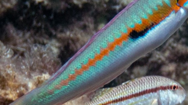 Mit seinem bordürenartig gezackten orangeroten Seitenstreifen auf türkisfarbenem Hintergrund ist dieses Meerjunker Männchen (Coris julis) ganz unverwechselbar. Das Foto entstand am 17. Juli 2024 vor der Epirusküste: https://www.inaturalist.org/observations/254024523. Im Hintergrund sind noch zwei Streifenbarben zu sehen. Das Wasser ist an dieser Stelle vor der Epirusküste kristallklar und wir haben dort durch Zufall einen wunderschönen Tauchspot gefunden mit vielen entspannten Fischen, die leuchtende Farben hatten.