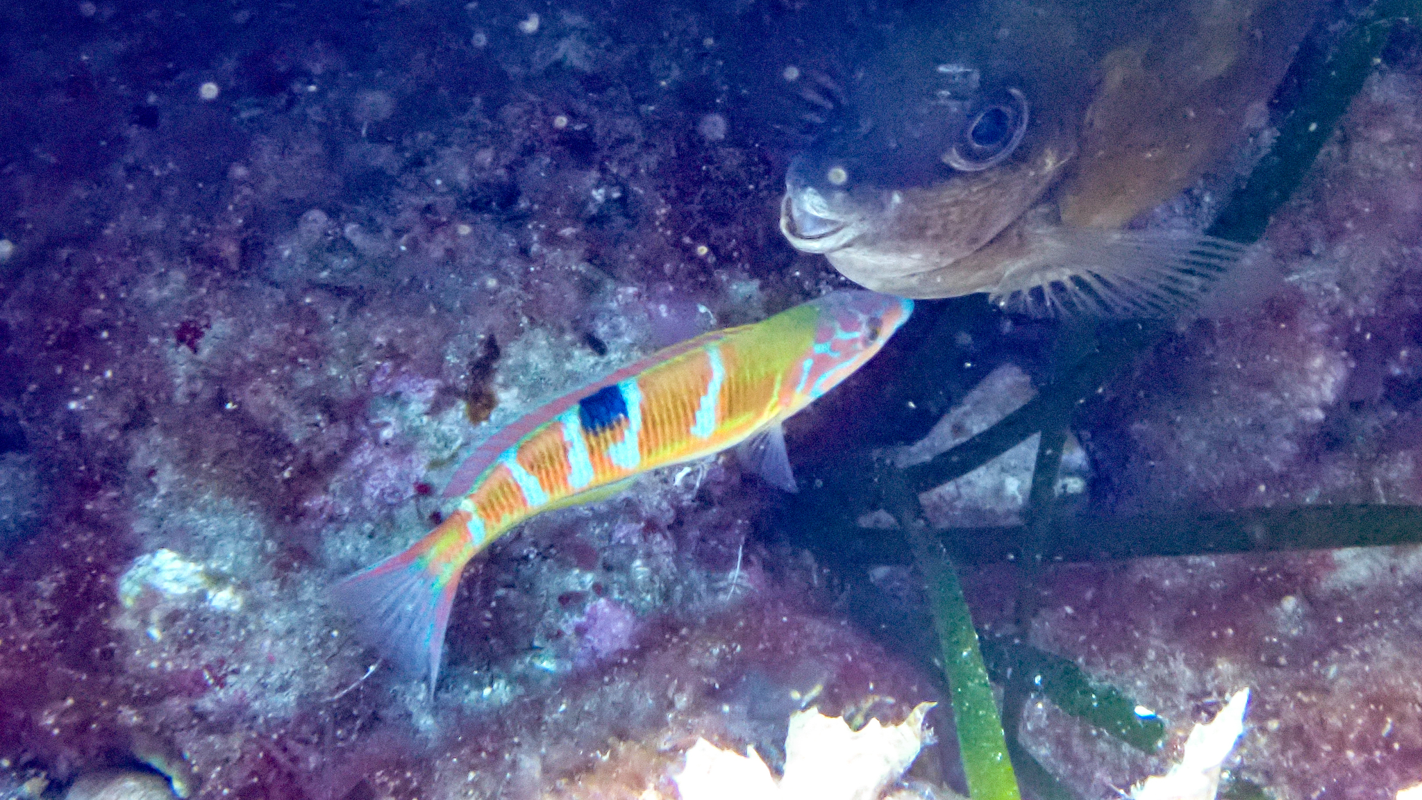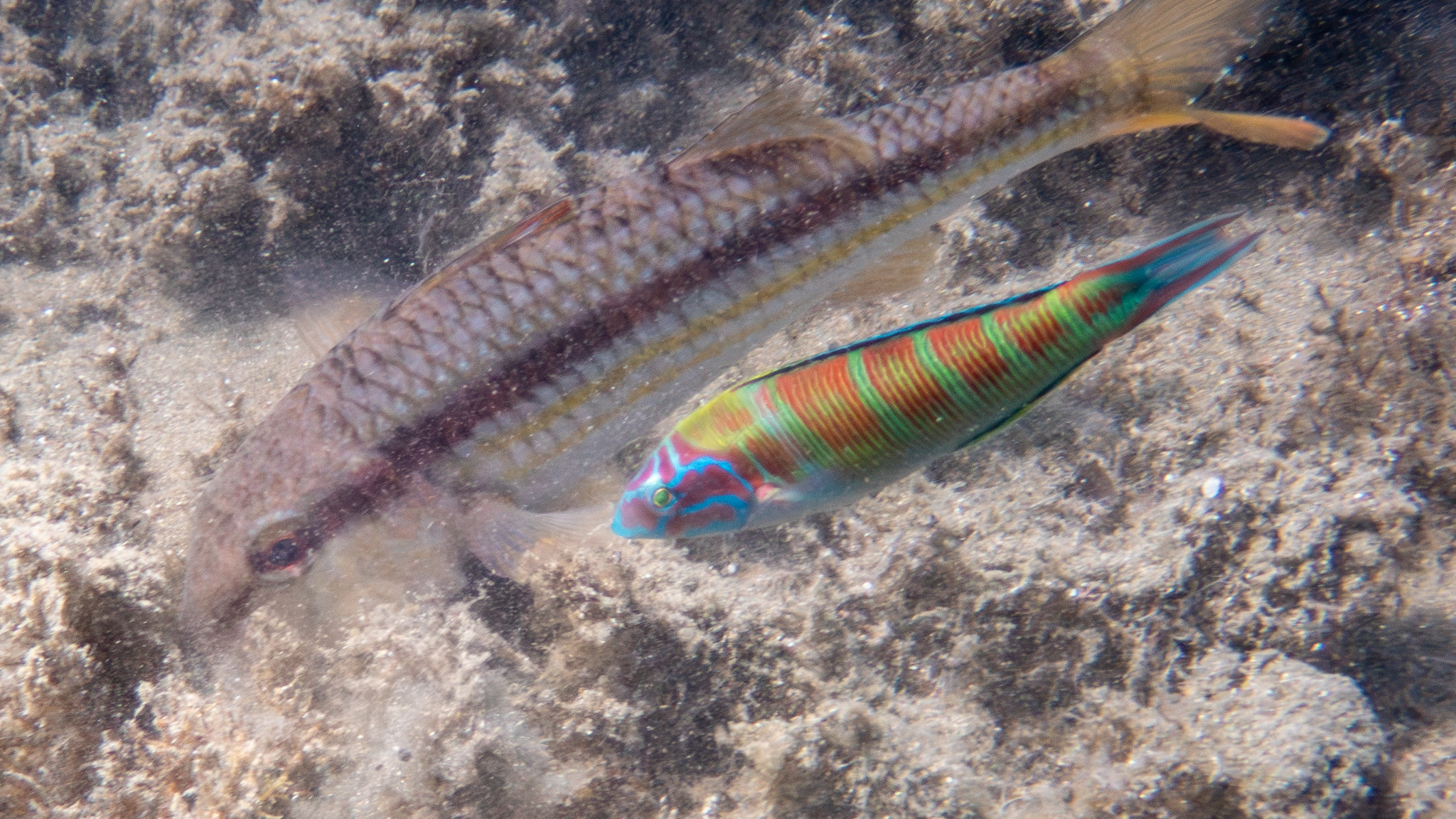 Meepfauen sind Fleischfresser und ernähren sich von kleinen Wirbellosen. Hier profitiert ein Meerpfau davon, dass eine Streifenbarbe auf der Suche nach Futter den Untergrund mächtig aufwühlt, so dass auch für den Meerpfau noch etwas abfällt: