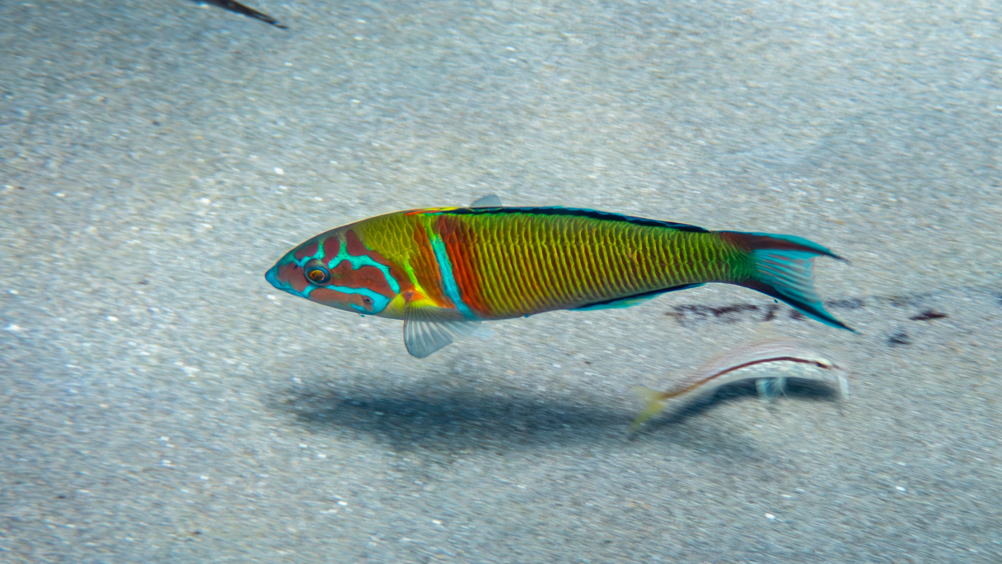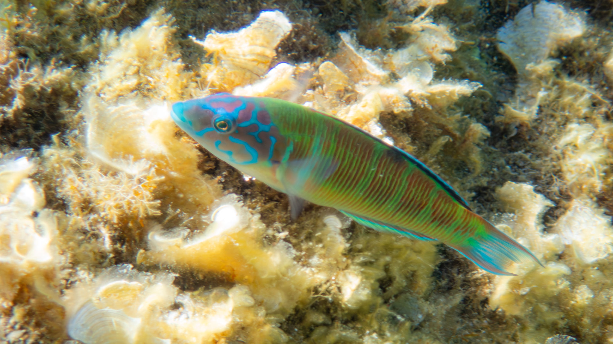 Am 11. September 2022 fotografierten wir dieses farbenprächtige Meerpfaumännchen (Thalassoma pavo), an der Südostspitze von Kefalonia: https://www.inaturalist.org/observations/134633237