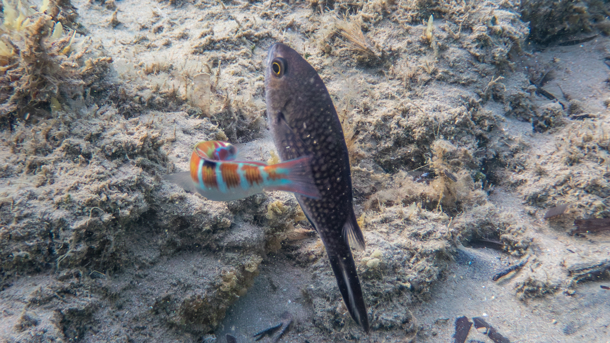 Auf dem nächsten Bild sieht man ein Mönchsfisch Pärchen, das gemeinsam ihr Revier verteidigt und auf dem folgenden Bild sieht man deutlich die aufgestellte Rückenflosse des Männchens.